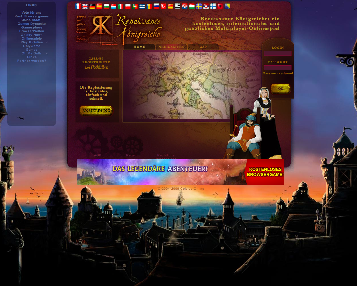 Die königreiche ist mit über 150.000 aktiven Spielern eine der größten Rollenspiele im Internet. Jeder Spielt wohnt in einer realen mittelalterischen Stadt Europas, wo er mit der Hilfe oder gegen der anderen Bewohnern versucht, die Stadt oder die Grafschaft zu beherrschen. Ein Download oder eine Installation sind nicht erforderlich.